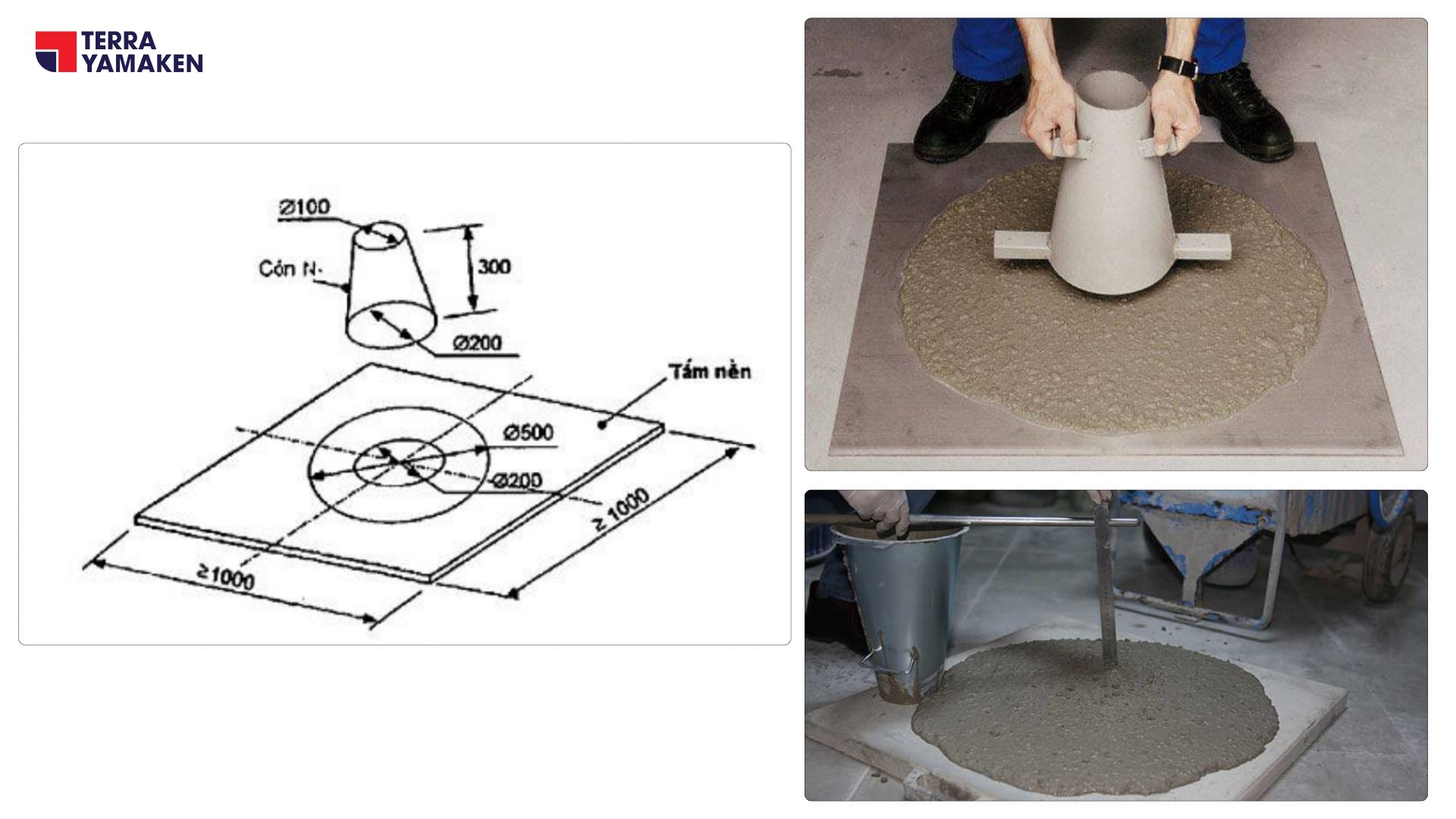 – Xác định độ chảy loang và thời gian chảy loang: Phương pháp này dùng để khảo sát khả năng điền đầy của hỗn hợp BTTL. Độ chảy loang chỉ khả năng biến dạng tự do, không bị hạn chế, và thời gian chảy loang chỉ tốc độ biến dạng trong một khoảng chảy loang quy định.
