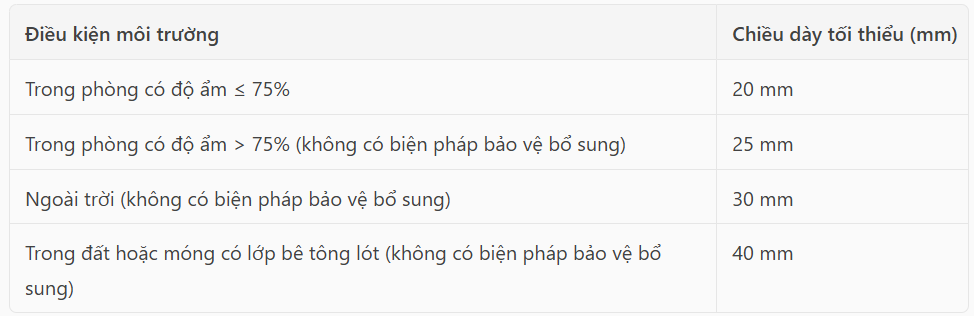 Để đảm bảo khả năng chống ăn mòn và độ bền lâu dài của kết cấu bê tông cốt thép, lớp bê tông bảo vệ cốt thép cần được thiết kế và thi công đúng theo quy định tại TCVN 5574:2018 – Thiết kế kết cấu bê tông và bê tông cốt thép, mục 10.3.1.2. Chiều dày lớp bảo vệ phải được xác định dựa trên vai trò của cốt thép (chịu lực hay cấu tạo), loại cấu kiện (cột, dầm, bản sàn, móng, tường…), đường kính và loại cốt thép, đồng thời tuân thủ yêu cầu về môi trường làm việc theo TCVN 12251:2018. Theo Bảng 19 của TCVN 5574:2018, chiều dày tối thiểu của lớp bê tông bảo vệ cốt thép chịu lực được quy định như sau:Việc tuân thủ đúng chiều dày lớp bảo vệ không chỉ đảm bảo tuổi thọ kết cấu mà còn góp phần giảm thiểu nguy cơ nứt do ăn mòn và các hư hỏng liên quan đến môi trường.