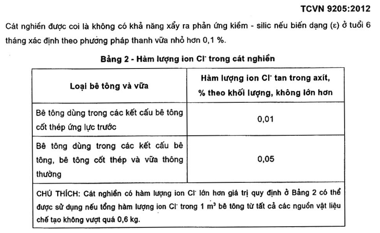 - TCVN 9205:2012: Hàm lượng ion Cl⁻ tan trong axít không vượt quá 0,05% đối với bê tông cốt thép thông thường và 0,01% đối với bê tông cốt thép ứng lực trước (Bảng 2). Hàm lượng hạt sét không lớn hơn 2%, đồng thời phải kiểm tra khả năng phản ứng kiềm–silic để đảm bảo cốt liệu vô hại.