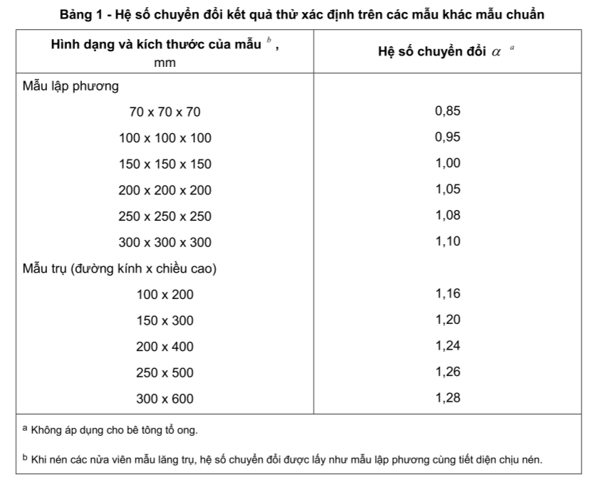 - α is the conversion factor for adjusting the test results obtained on non-standard samples to the compressive strength of standard samples (cubic samples with dimensions of 150 mm x 150 mm x 150 mm). The α factor is determined experimentally according to the procedure in Appendix B or taken from Table 1.