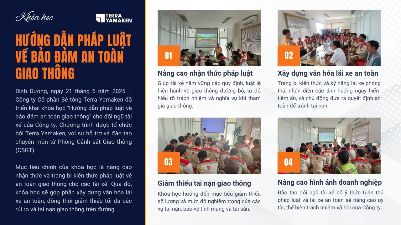 Binh Duong, June 21, 2025 – Terra Yamaken Concrete Joint Stock Company has launched the “Traffic Safety Law Guidance” course for its team of drivers. The program was organized by Terra Yamaken, with professional support and training from the Traffic Police Department (CSGT) of Binh Duong Provincial Police.